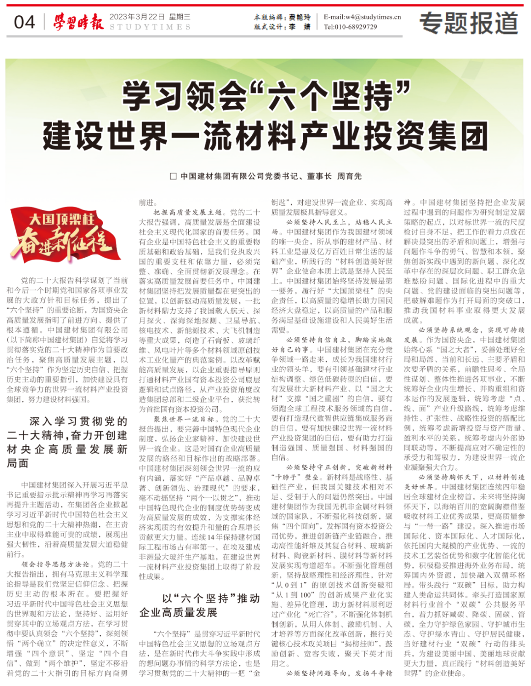 近日,《學習時報》“大國頂梁柱 奮進新征程”專欄刊發(fā)了中國建材集團黨委書記、董事長周育先署名文章。文章聚焦高質(zhì)量發(fā)展主題,以“六個堅持”科學方法論指引我們加快建設世界一流材料產(chǎn)業(yè)投資集團,努力建設材料強國。